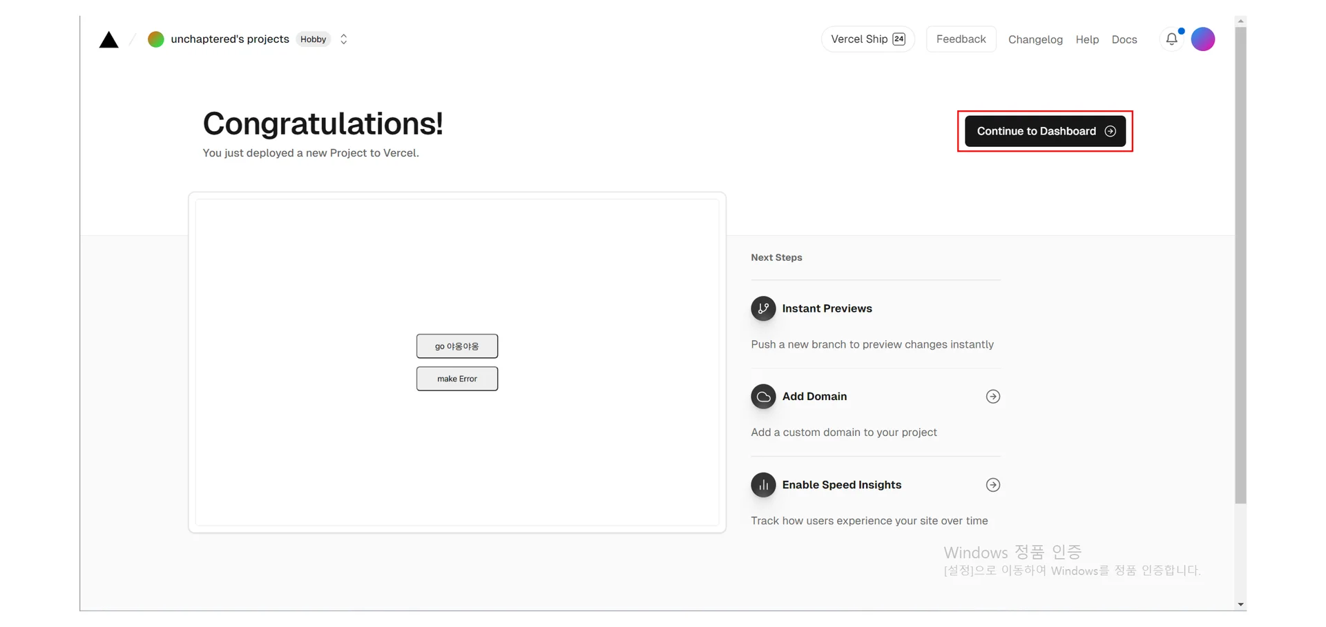[Continue to Dashboard] 클릭하여 배포 결과 확인하기