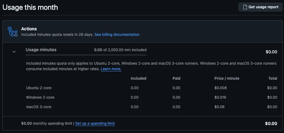 Ubuntu-2-core에서 2,000분을 초과하는 경우 1분당 0.008$가 청구됩니다.
