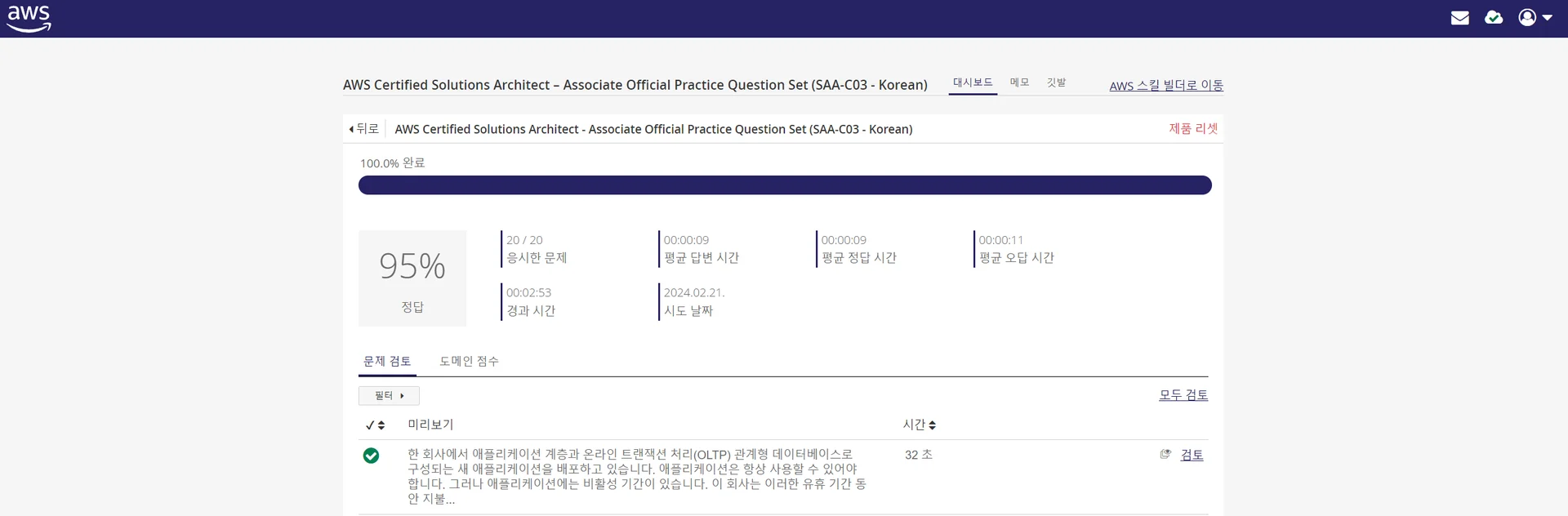 ResultI took the exam through AWS Skill Builder, which I learned about from the AWSKRUG study group's guide. It was an AWS SAA-C03 mock exam with 20 questions.