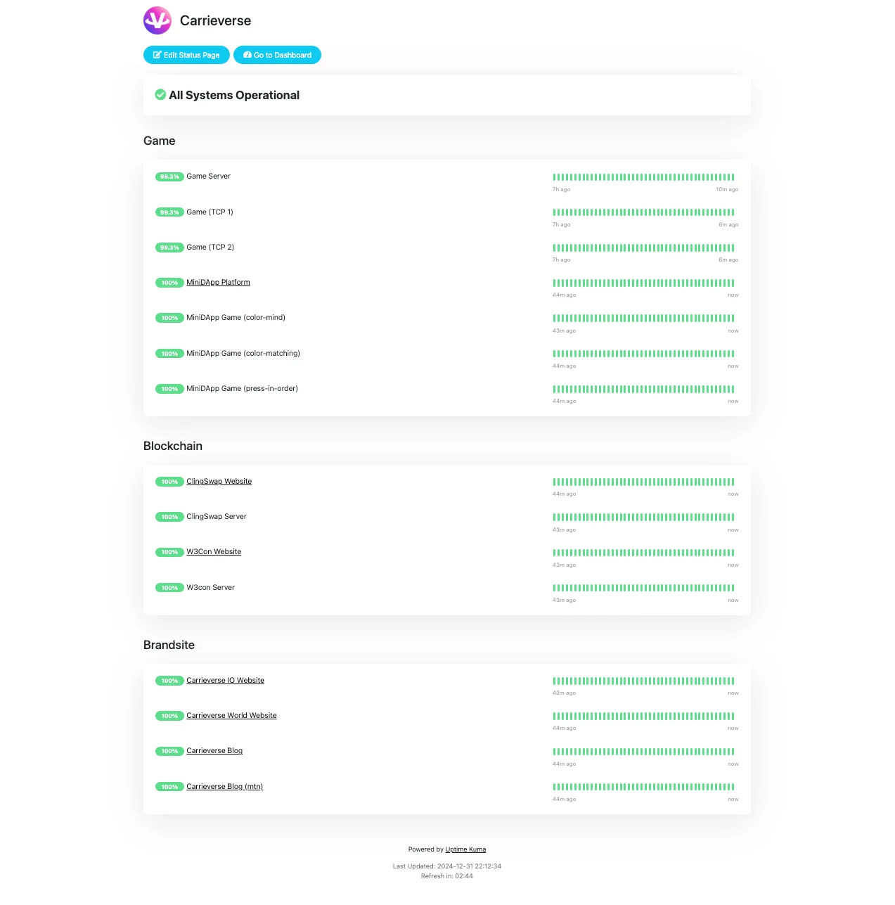 결과적으로 CarrieVerse Status, HAR Status을 운영하기 시작했습니다.Atlassian Statuspage를 쓰고 싶었는데 Atlassian 계정이 버그가 걸려서 급하게 오픈소스로 갈음하게 되었는데, 생각보다 적은 리소스로 잘 운영이 되고 있다.